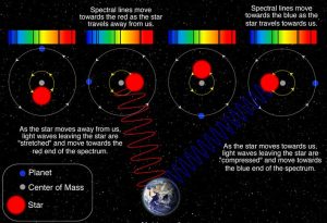 Método da velocidade radial. Quando a estrela se afasta de nós, o seu espetro desloca-se para o vermelho e quando se aproxima, para o azul. Crédito: Las Cumbres Observatory.