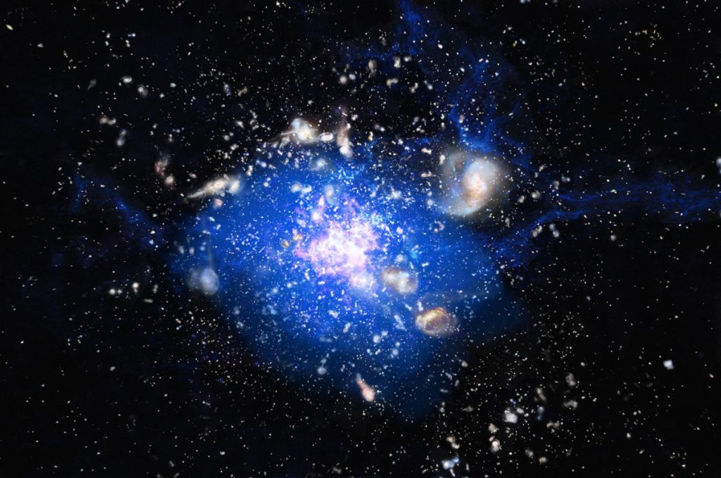 Na imagem, vemos as protogaláxias (a branco e rosa), e o monóxido de carbono que envolve as galáxias (a azul).