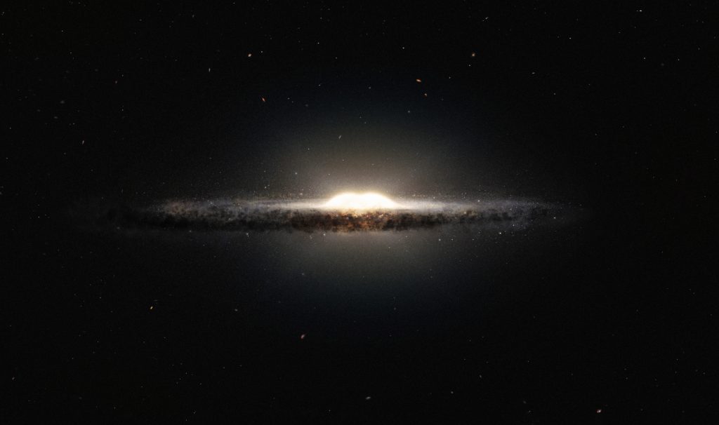 Esta impressão artística mostra o aspecto que a Via Láctea teria ao ser vista quase de lado e a partir de uma perspectiva muito diferente daquela a que estamos habituados a ver aqui da Terra. O bojo central aparece como uma bola brilhante com a forma um amendoim e os braços espirais e suas nuvens de poeira associadas formam uma banda estreita. Créditos: ESO/NASA/JPL-Caltech/M. Kornmesser/R. Hurt