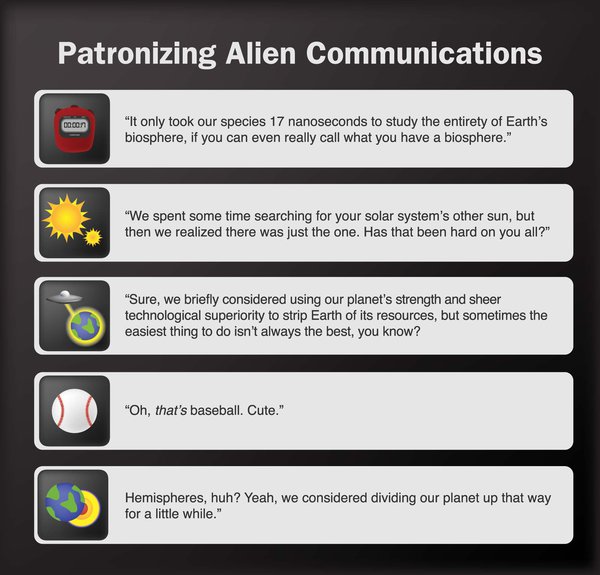 “After telling us they hadn’t exactly been holding their breath waiting for us to figure out how to make contact with our ‘charmingly simplistic devices,’ they informed us they had studied our planet millennia ago but decided it was ‘too hopelessly primitive to be worthwhile.'”