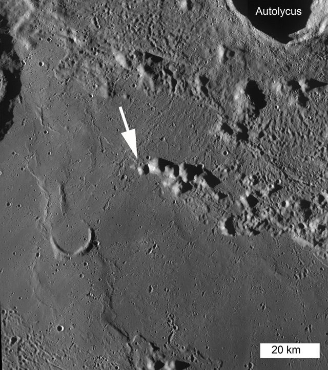 Colinas na região a sul do manto de ejecta da cratera Autolycus. A seta branca indica a estrutura ilustrada nas imagens de cima (cliquem aqui para verem a imagem na sua máxima ampliação).