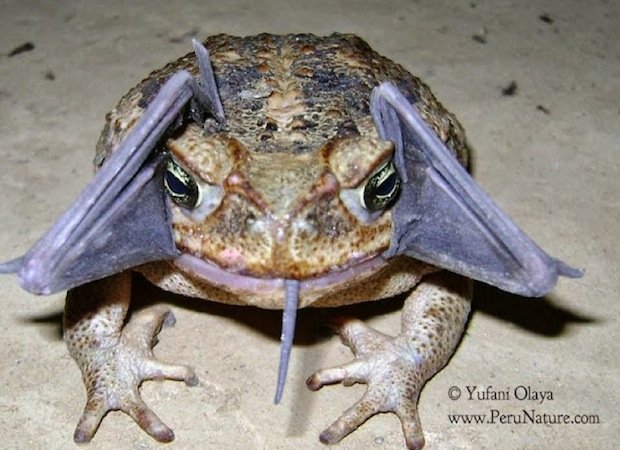 Na verdade, o que aconteceu é que sem querer um sapo engoliu um morcego. O sapo estava com a boca aberta e o morcego voou directamente para a sua boca. Mas o sapo não o chegou a comer. Momentos após esta fotografia ter sido tirada, o sapo cuspiu o morcego, que após algum tempo recuperou finalmente do susto…