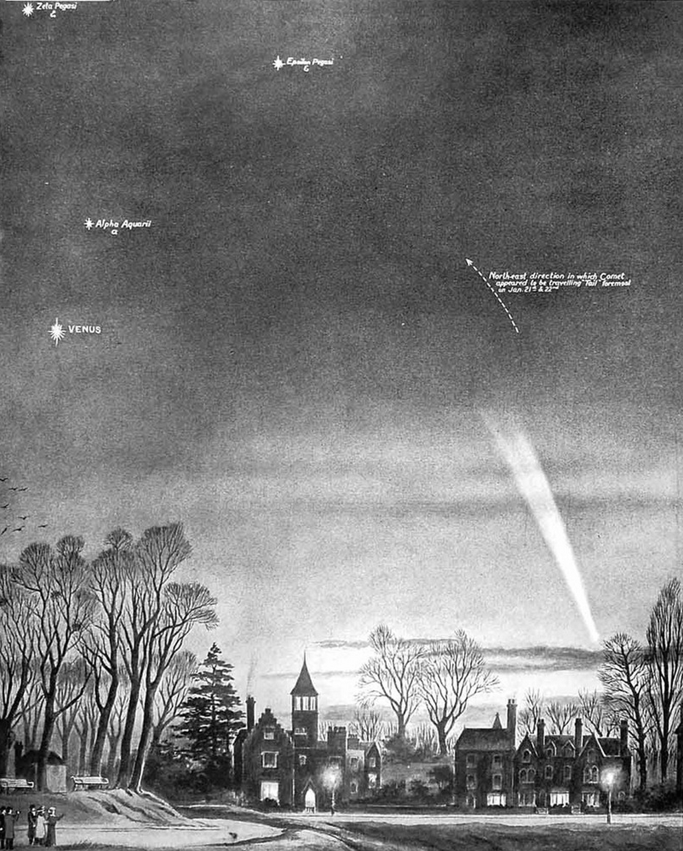 [O Grande Cometa de Janeiro de 1910 desenhado por G. F. Morrel, às 5:10 p.m. do dia 21 de Janeiro de 1910, em Hampstead Heath, na região norte de Londres.]