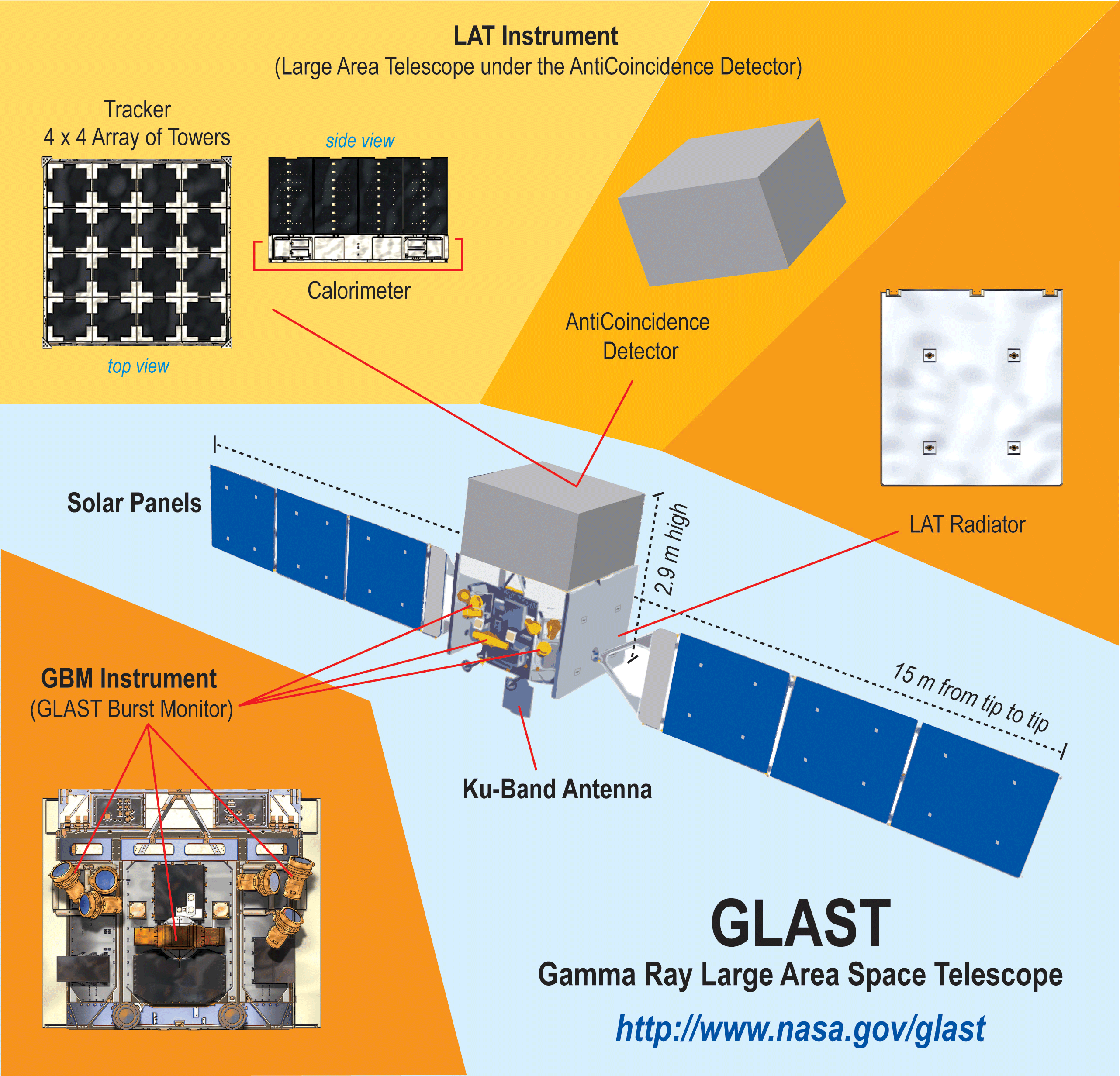 [O Telescópio Espacial Fermi com as respectivas dimensões e componentes. O Fermi observa o firmamento em raios gama, a forma mais energética de radiação. Crédito: NASA.]
