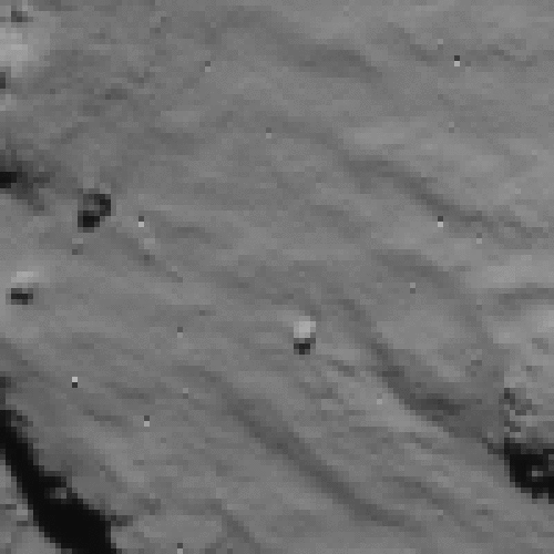 Local do primeiro contacto da sonda Philae com a superfície do cometa 67P/Churyumov–Gerasimenko, visto pela câmara de navegação da Rosetta, a 12 de novembro de 2014. As duas imagens que compõem esta animação mostram o súbito aparecimento de uma mancha escura no centro de Agilkia – uma clara evidência de que a pequena sonda tocou no interior da elipse de pouso.