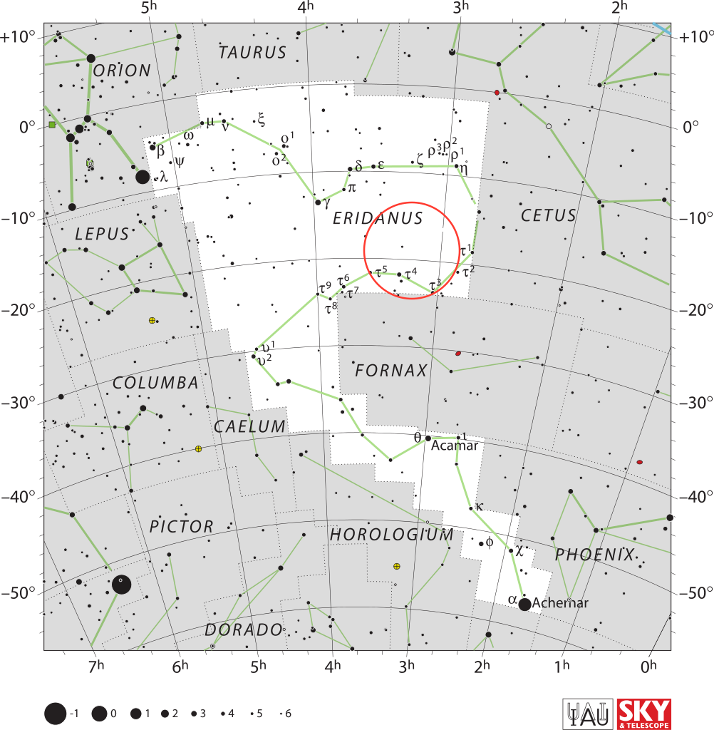 [A constelação do Erídano (Eridanus) com os limites actuais fixados pela União Astronómica Internacional. A direcção do Grande Vazio do Erídano está assinalada pelo círculo vermelho. Crédito: IAU e Sky&Telescope, edição pelo autor.]