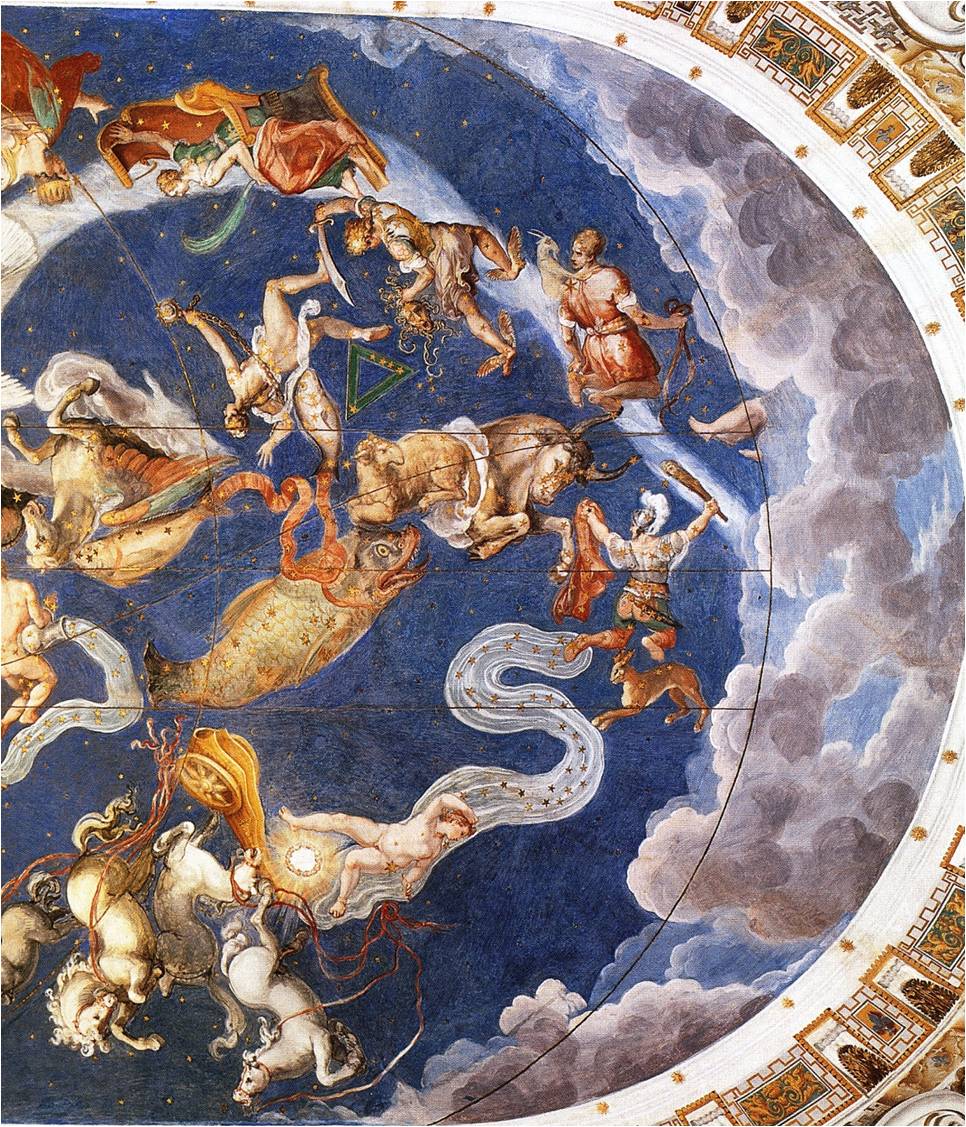 [Faetonte cai da quadriga solar e despenha-se no rio Erídano, que nasce aos pés de Orionte. Pintura da esfera celeste por Giovanni de Vecchi e Raffaellino da Reggio. Abóboda da Salle de la Mappemonde (1574–1575), no Palácio de Caprarola, em Farnese, Itália.]