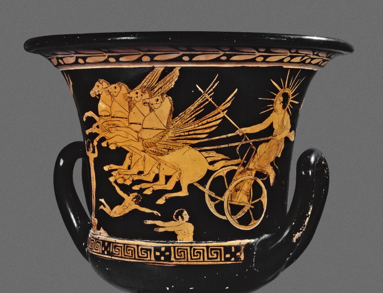 [Cerâmica grega ilustrando a quadriga com quatro cavalos alados em que viajava Hélio, o deus solar, durante o dia (séc. V a.C.). Crédito: British Museum.]