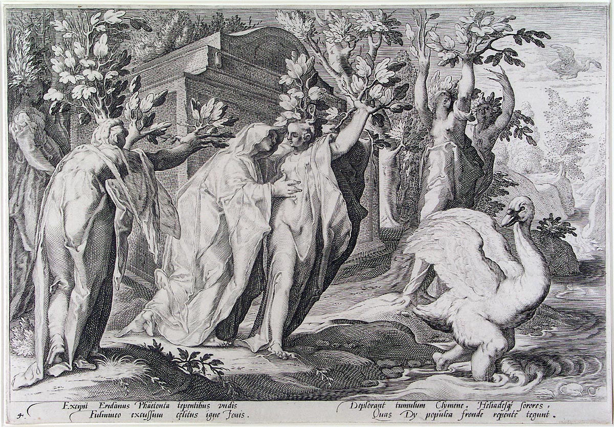 [As irmãs de Faetonte choram a morte do seu irmão nas margens do rio Erídano e são transformadas em choupos. Nesta cena, o túmulo de Faetonte é visível em segundo plano e Climene junta-se às suas filhas no luto. Cycnus, outro parente de Faetonte, pelo seu luto foi transformado num cisne — um dos mitos associados à constelação do Cisne — , mas essa é outra história! Gravura de Robert Willemsz de Baudous. Fonte: Museum Boijmans Van Beuningen.]