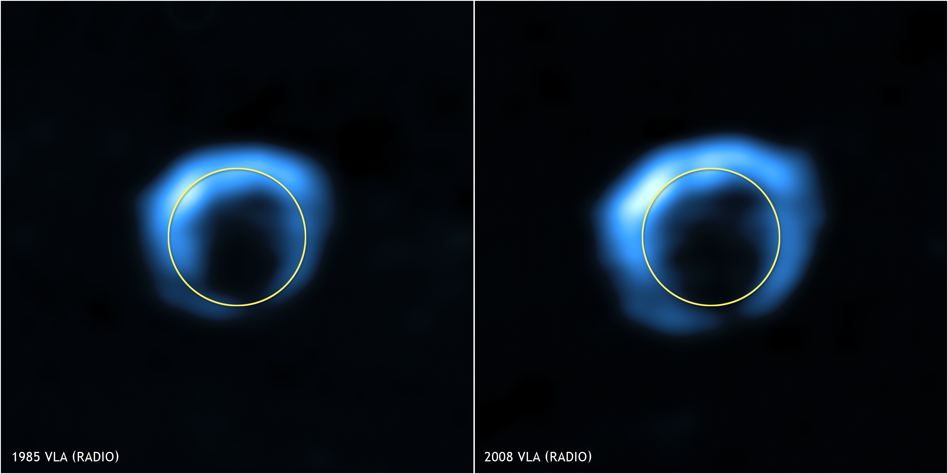 {Imagens do G1.9+0.3 obtidas com o VLA com um intervalo de 23 anos. A forma anelar e a expansão do remanescente são evidentes. Crédito: NSF, NRAO, VLA, Cambridge, D.Green et al..}
