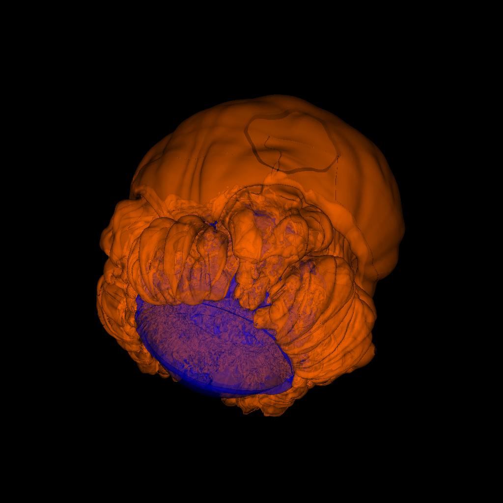 {Fotograma de uma simulação da explosão termonuclear de uma anã branca — uma supernova de tipo Ia. A superfície da anã branca (azul) é ainda visível mas está prestes a ser engolida por uma enorme bolha (laranja) de produtos da fusão explosiva do carbono. Da colisão da frente desta bolha resulta uma onda de choque que destrói a anã branca. Crédito: George C. Jordan, ASC FLASH CENTER, University of Chicago}