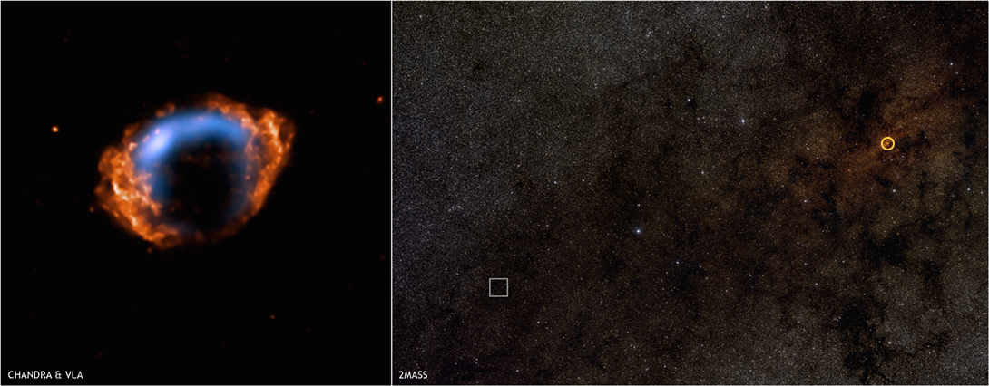 {À esquerda: imagem do remanescente G1.9+0.3, em raios X e ondas de rádio. À direita: a posição do remanescente (caixa) junto ao núcleo galáctico (círculo); nesta imagem é bem visível a densidade de nuvens de poeira interestelar na direcção de G1.9+0.3. Crédito: NASA, NRAO e 2MASS.}