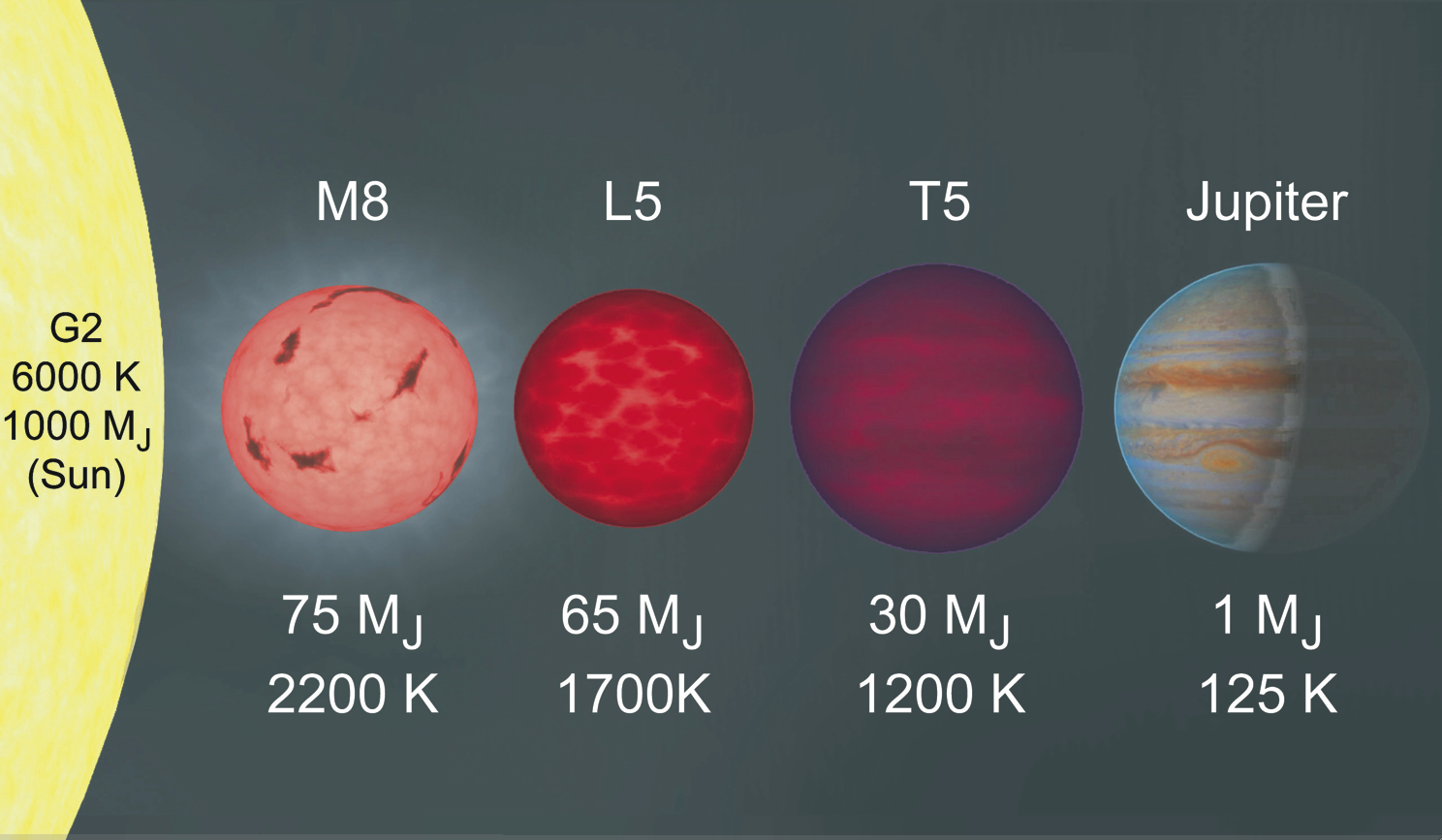As anãs vermelhas mais pequenas têm 75 vezes a massa de Júpiter e uma temperatura superficial de apenas 2200 Kelvin, quase três vezes mais baixa do que a do Sol. À direita mostram-se anãs castanhas de tipos L e T (existe ainda um outro, o tipo Y). Júpiter é representado para estabelecer uma escala, juntamente com o Sol. Note-se que as anãs vermelhas mais pequenas e as anãs castanhas têm quase o mesmo tamanho, semelhante ao de Júpiter, devido à força que as sustenta internamente.