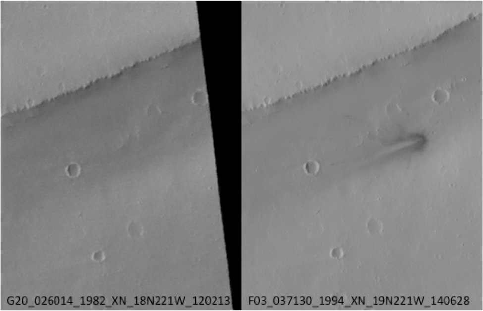 Impacto em Elysium Planitia, antes e depois. Imagens obtidas pela câmara de contexto da sonda Mars Reconnaissance Orbiter, em fevereiro de 2012 (esquerda) e em junho de 2014 (direita).