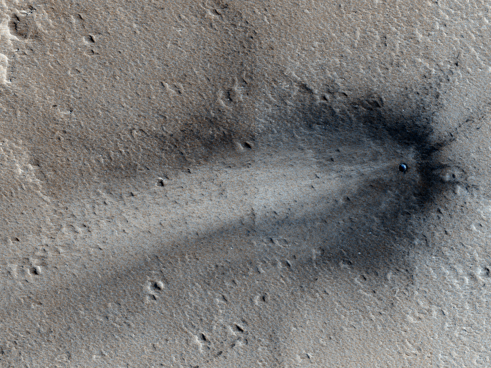 A cratera não aparece numa outra imagem da mesma região, captada em fevereiro de 2012, pelo que esta estrutura terá sido formada há menos de 34 meses. O impacto pulverizou as rochas superficiais e exumou materiais escuros de camadas mais profundas, espalhando-os pela paisagem num distintivo padrão, que contrasta com o terreno claro desta região de Marte. A distribuição do manto de ejeta sugere que o projétil terá atingido a superfície vindo de oeste.