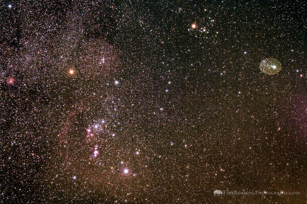 Você pode identificar as estrelas familiares da constelação rica em nebulosas do Caçador à esquerda, e seguindo este link você pode localizar o cometa Lovejoy neste campo de visão amplo.