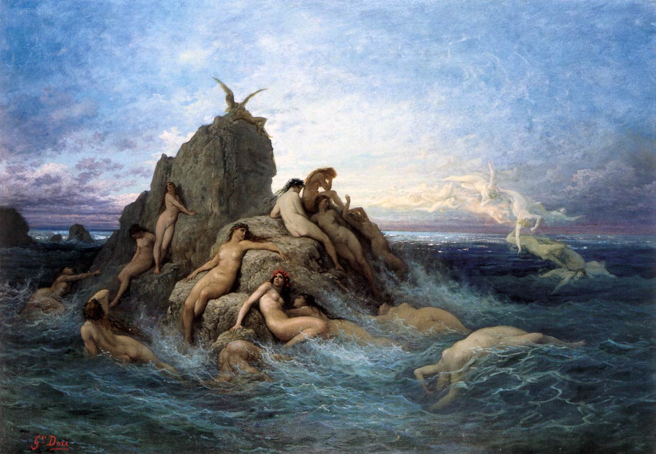 As nereidas, as 50 filhas dos titãs Nereu e Doris, eram belíssimas criaturas de corpo feminino que habitavam o oceano. Gustave Doré, circa 1860.