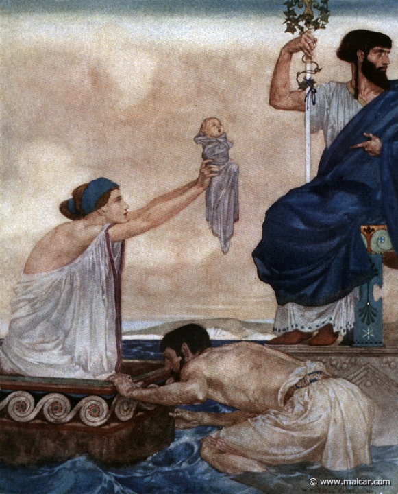 Acrísio indiferente às súplicas de Danae pelo seu filho Perseu. Os dois seriam lançados ao mar numa arca fechada, para uma morte quase certa. William Russell Flint, 1911.