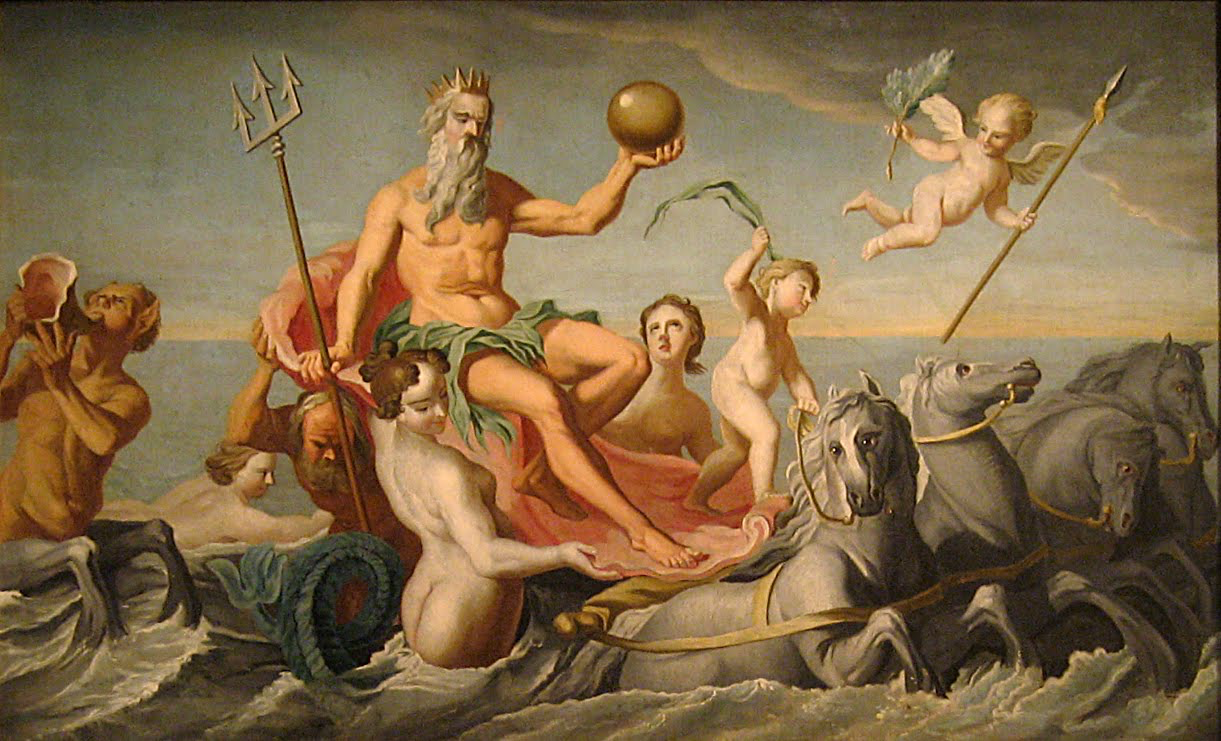 Poseidon, o deus do mar, na sua quadriga, acompanhado pelas nereidas e pelos tritões. John Singleton Copley, 1754.