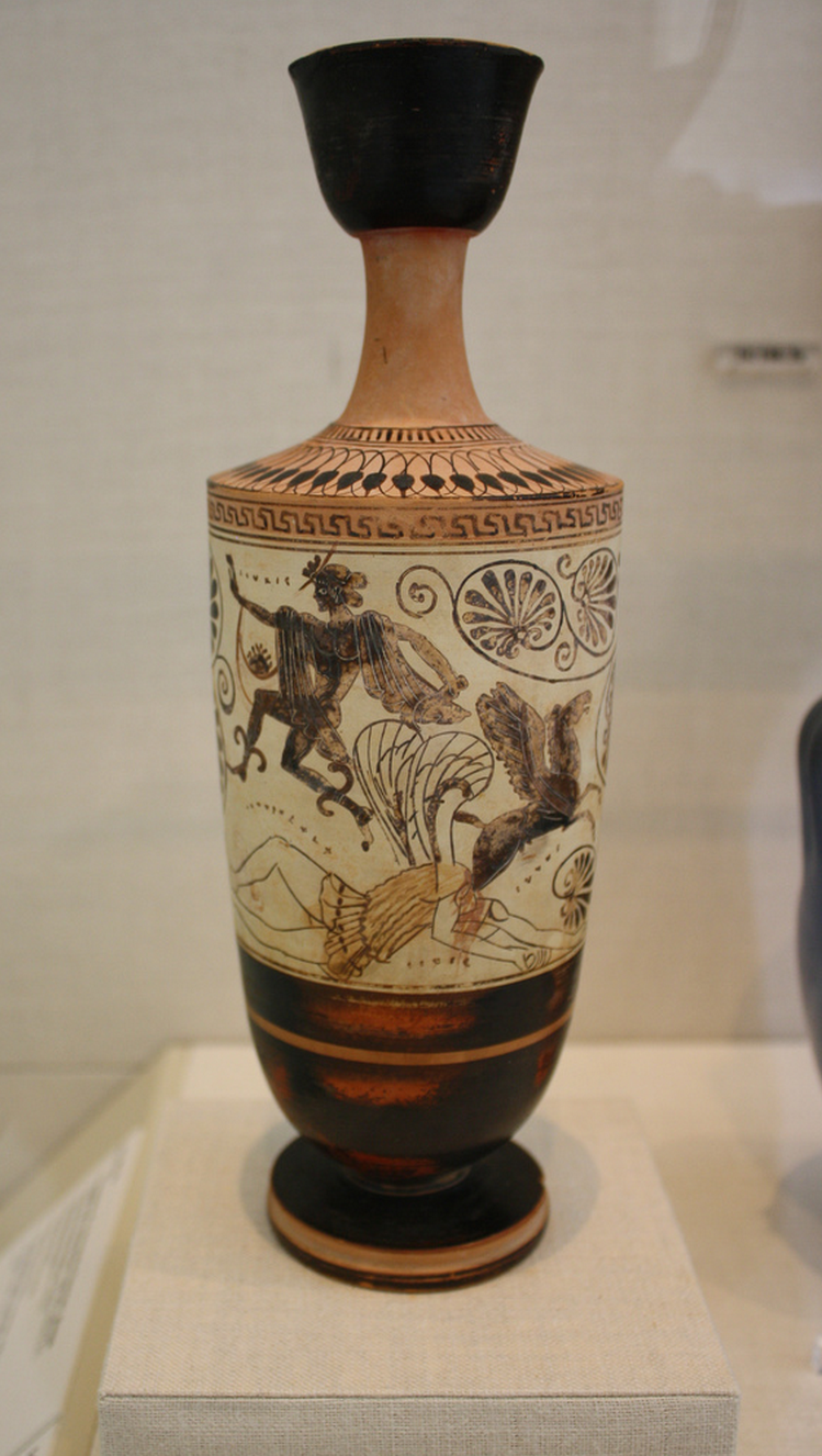 Perseu afasta-se de Medusa decapitada, levando a sua cabeça num saco. A presença protectora da deusa Atena é constante.