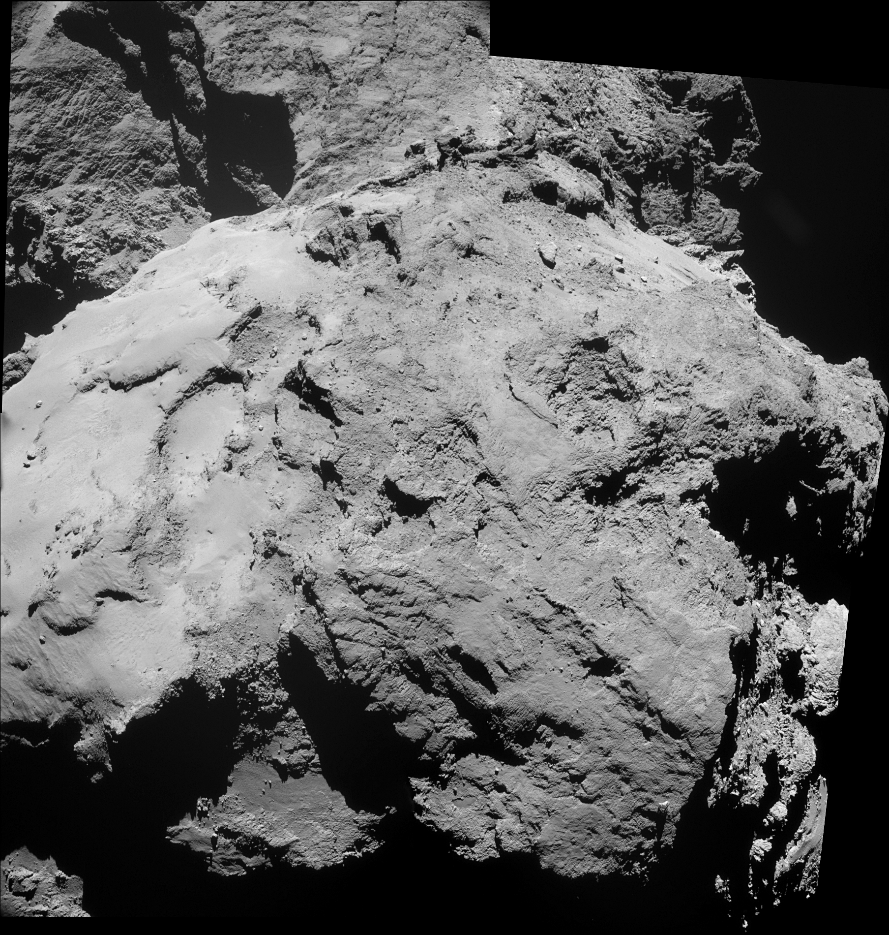 O mosaico de cima foi captado pouco tempo depois da passagem da Rosetta pelo ponto de maior aproximação, e mostra a região de Imhopet, uma vasta área plana situada no lobo maior de 67P. No topo podemos ver uma planície coberta de poeira, onde se destaca um conjunto de rochedos isolados – o maior dos quais, Quéops, com cerca de 45 metros de diâmetro. Mais abaixo encontramos um grupo de enigmáticas estruturas circulares e uma estrutura semelhante a uma mesa, delimitada pelo que parece ser uma escarpa estratificada.
