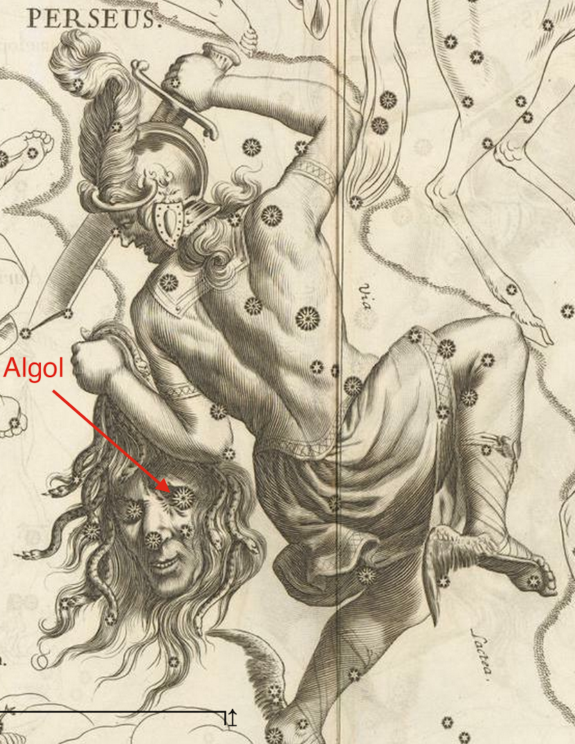 A estrela Algol, na constelação de Perseu, marca a posição de um dos olhos da cabeça de Medusa, a górgona decapitada pelo herói grego. Algol é o protótipo por excelência dos sistemas binários com eclipses. Pormenor de gravura da obra Uranographia, de Johannes Hevelius. Fonte: ETH Bibliothek.