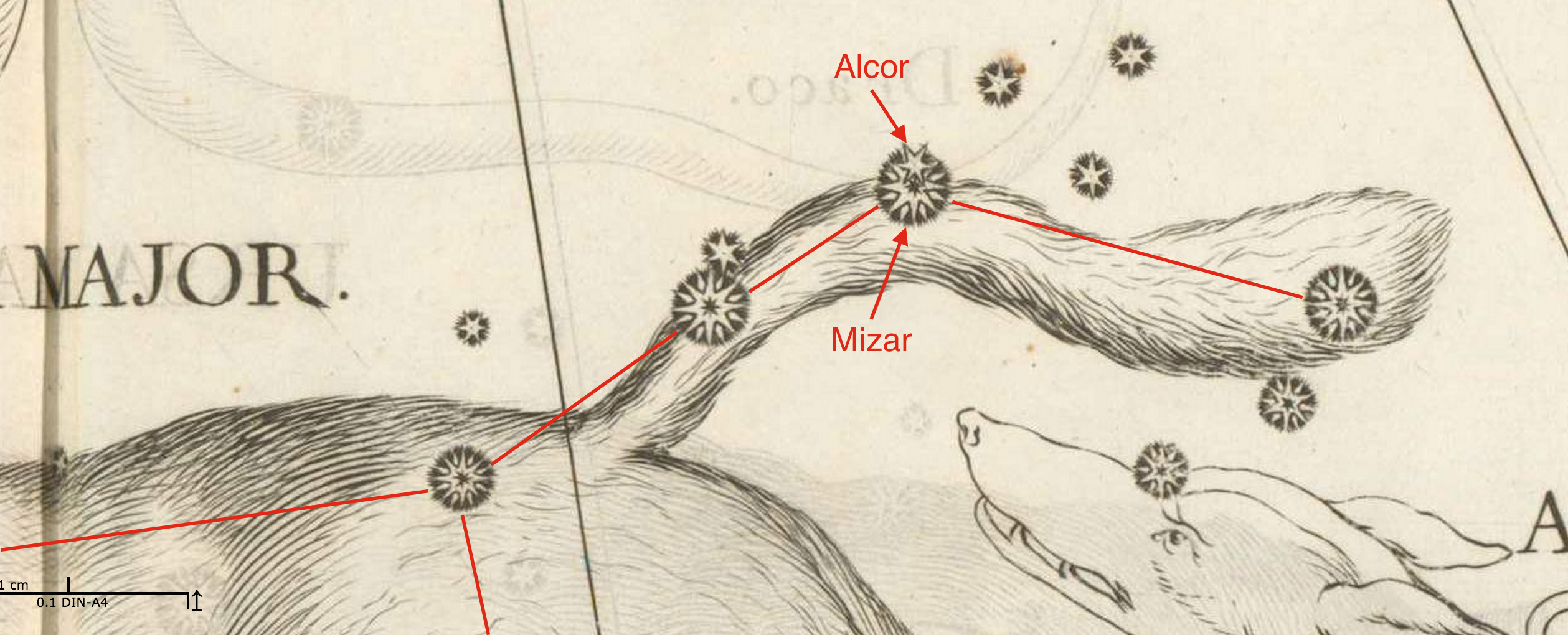 O par Mizar e Alcor, no centro da cauda da Ursa Maior. Pormenor de gravura da obra Uranographia, de Johannes Hevelius. Fonte: ETH Bibliothek.