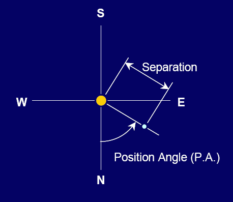 Os astrónomos medem a posição da estrela secundária de um sistema binário (azul) relativamente à primária (amarela) medindo dois ângulos: a separação angular entre as componentes, e o ângulo de posição, medido relativamente à direcção Norte (P.A. = 0). Ao longo de décadas ou mesmo séculos, as posições desenham a elipse orbital.