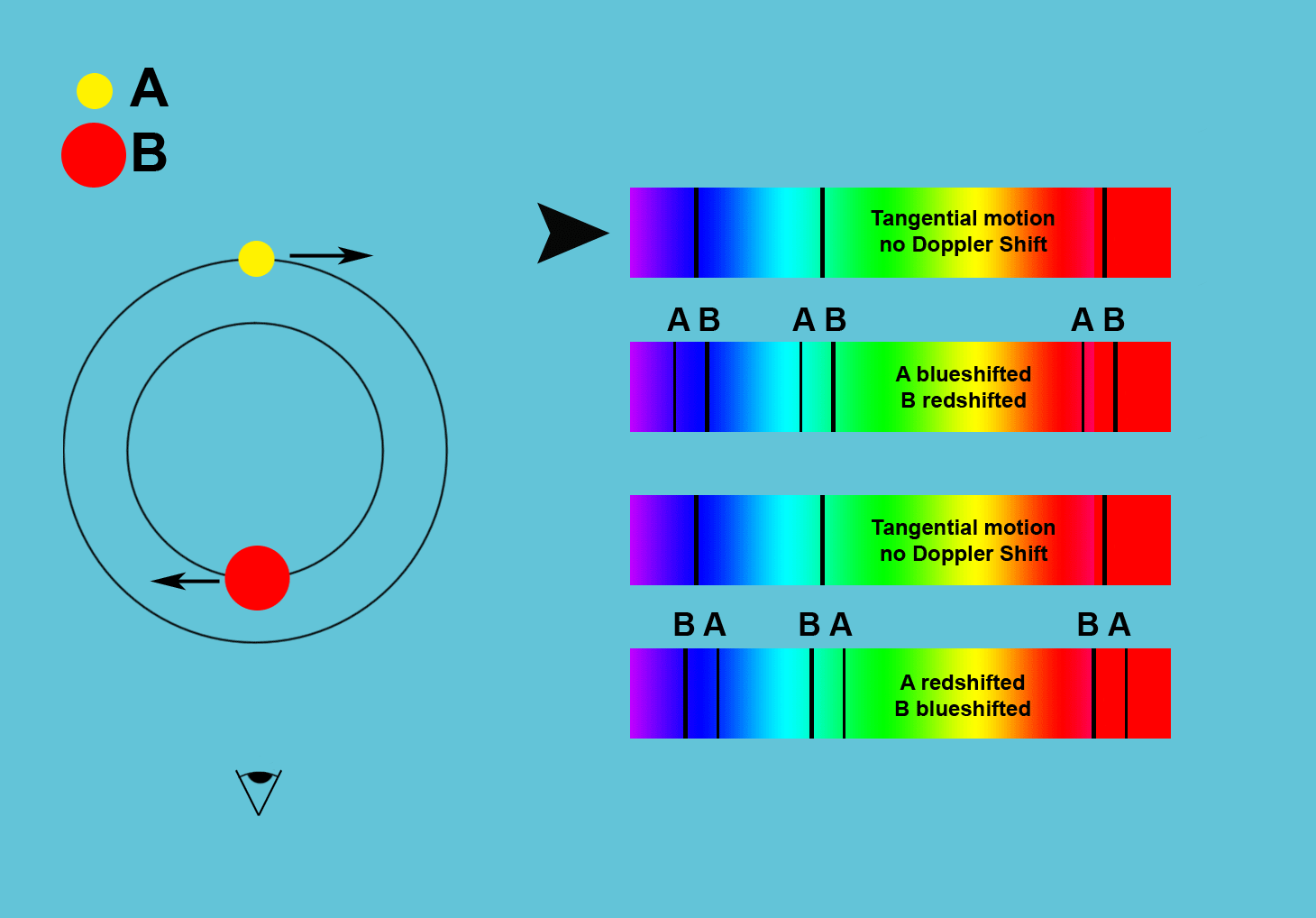 Por vezes, as componentes de um sistema binário estão demasiado próximas para poderem ser separadas por um telescópio. Nestes casos não é possível fazer o estudo da órbita pelo método acima descrito. No entanto, a análise da luz proveniente do sistema permite detectar as linhas espectrais das componentes separadamente. As linhas (riscas negras verticais no arco-íris) de uma componente movem-se ligeiramente para o azul quando esta se aproxima da Terra no seu movimento orbital, e ligeiramente para o vermelho quando se afasta. A análise desta informação espectral permite determinar, entre outros parâmetros, o período orbital do sistema e um valor mínimo para a massa total do sistema (o valor real depende da inclinação do sistema, que não é possível determinar apenas com esta técnica).