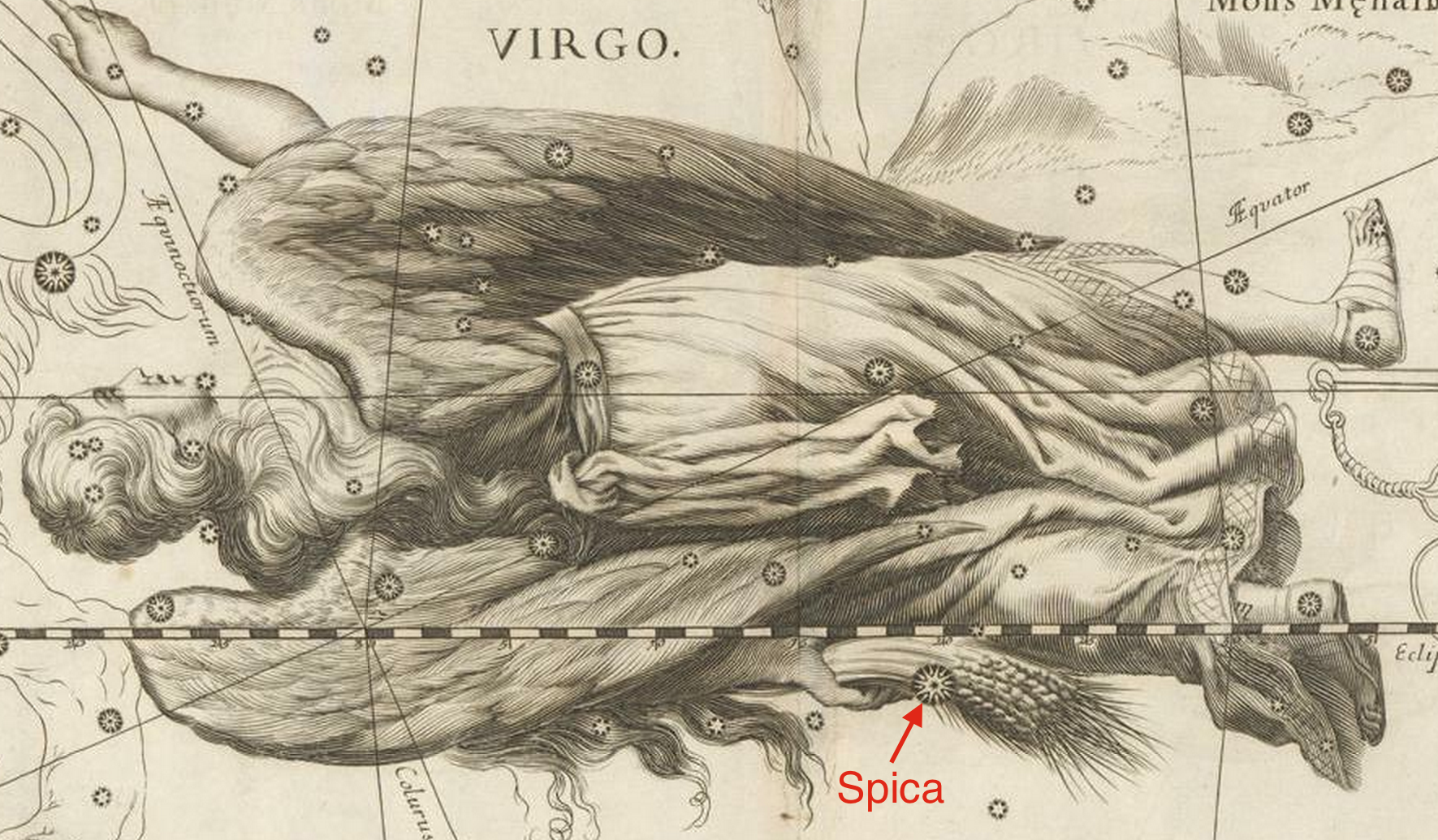 A estrela Spica, na constelação da Virgem, marca a posição da espiga na mão da deusa grega da fertilidade da terra e das colheitas, Demeter. Spica é um excelente exemplo de uma binária espectroscópica. Pormenor de gravura da obra Uranographia, de Johannes Hevelius. Fonte: ETH Bibliothek.
