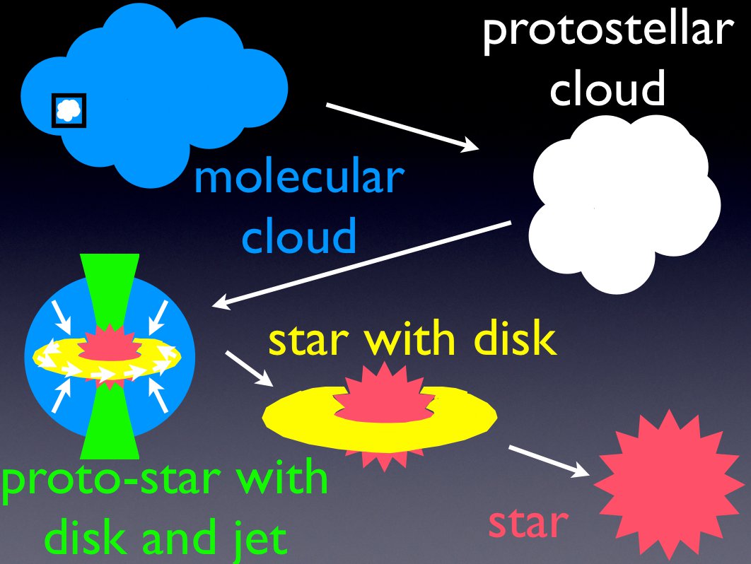 O colapso de uma nuvem protoestelar dá-se ao longo de milhares de anos até esse fragmento da nuvem se espalmar num disco rotativo, cujo centro é ocupado por uma protoestrela ainda em contracção. A certa altura, é atingida a temperatura crítica no centro da protoestrela e inicia-se a fusão do hidrogénio em hélio — uma nova estrela acaba de nascer. A radiação intensa que emite liberta-a do gás e poeira que ainda a envolvem, até que por fim se torna visível.