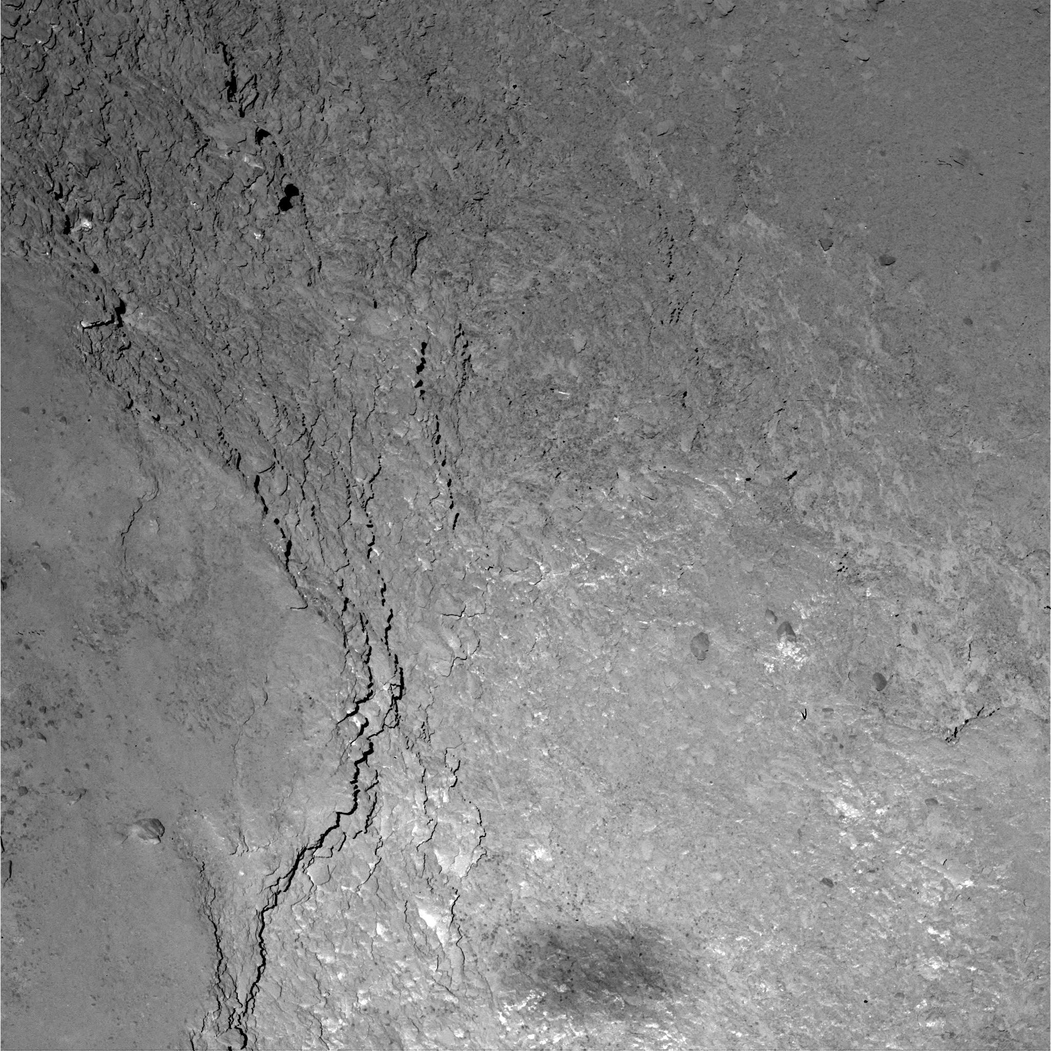 Foi ontem divulgada uma espetacular imagem da superfície do cometa 67P/Churyumov-Gerasimenko, captada pela câmara OSIRIS durante o mergulho vertiginoso que a Rosetta realizou no passado dia 14 de fevereiro. A imagem revela detalhes sem precedentes de uma pequena área localizada junto à fronteira entre as regiões de Imhotep e Ash, e inclui a sombra difusa da sonda europeia projetada numa faixa de terreno rugosa.
