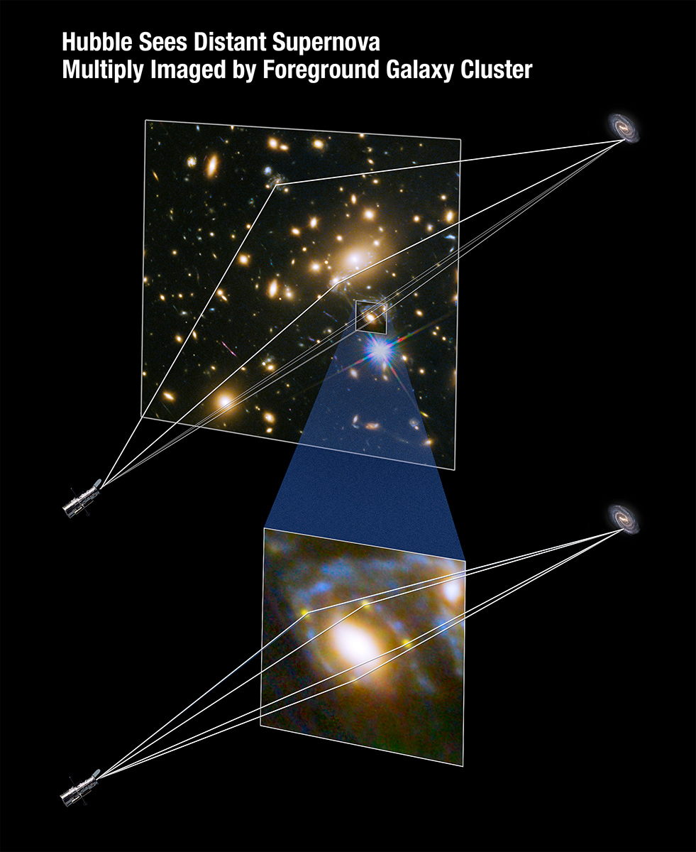 Devido à distribuição de massa heterogénea dentro do enxame, o MACS J1149.6+2223 funciona como uma lente muito complexa. A luz da supernova, ao passar por esta região do espaço, é forçada a percorrer caminhos diferentes até chegar a nós, atrasando-se mais ou menos na viagem. Por outras palavras, as 4 imagens que vemos da supernova mostram-na em momentos diferentes da explosão! De facto, os astrónomos conhecem tão bem esta lente gravitacional, através de observações complementadas com simulações em computador, que estimam que uma imagem da supernova deveria ter sido visível há cerca de 20 anos — a luz da supernova que percorreu o caminho mais curto dentro da lente. Uma nova imagem da supernova irá aparecer no enxame daqui a 5 anos, numa outra localização. Esta luz está a ser obrigada a percorrer um caminho mais longo e atrasou-se na sua viagem até à Terra.