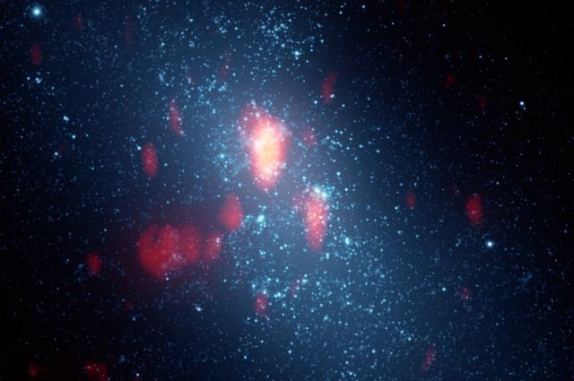 A região central da galáxia NGC5253 observada pelo Hubble (azul e branco) e pelo Submillimeter Array (vermelho a amarelo). As manchas brancas são enxames de estrelas jovens. As manchas vermelhas são nuvens moleculares, a mais brilhante das quais, ligeiramente acima e à esquerda do centro, é a “Nuvem D”. Crédito: Jean Turner.