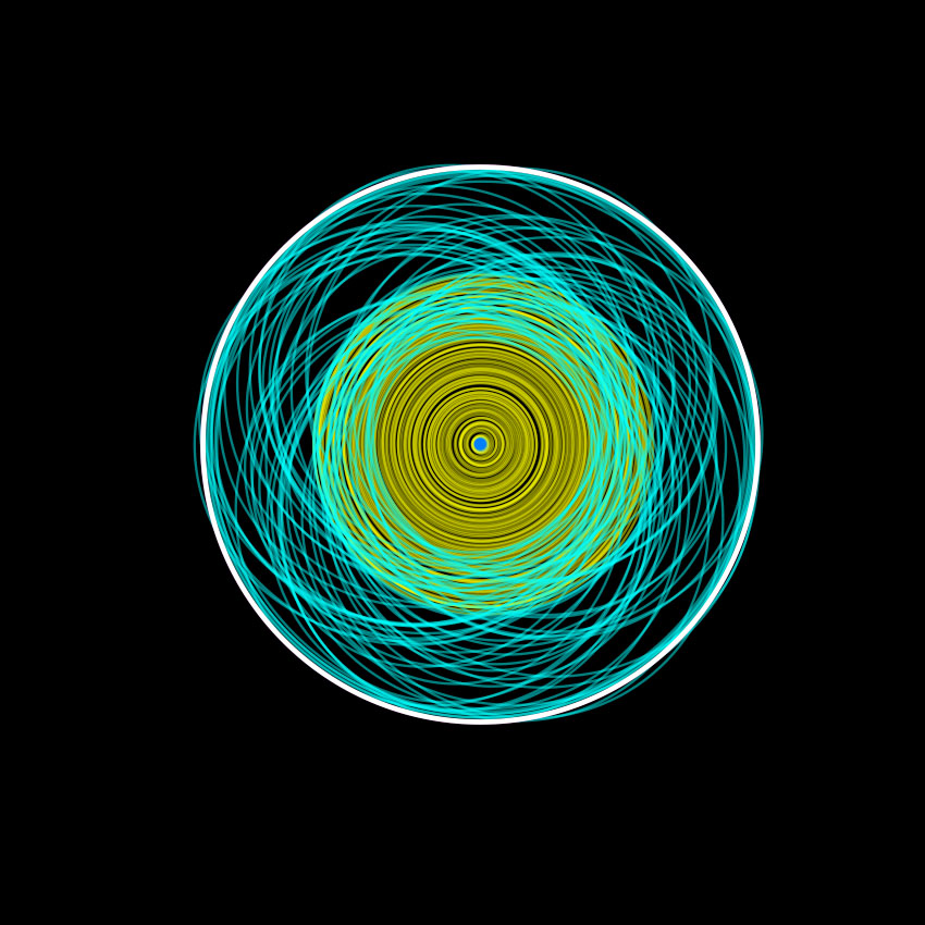 Simulação do Sistema Solar interior, nos primeiros milhões de anos após a formação do Sol. Estão representadas a azul turquesa as órbitas dos planetesimais perturbados durante a primeira fase de migração de Júpiter (órbita a branco). Estes objetos teriam sido clocados em órbitas elípticas, que se sobreporiam às órbitas de planetesimais não perturbados pelo gigante (órbitas a amarelo).