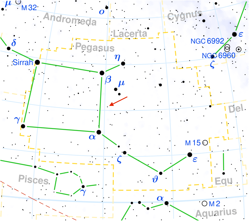 A localização da estrela 51 do Pégaso na constelação homónima. A estrela é visível a olho nu a partir de um local sem poluição luminosa. Crédito: Wikipedia.