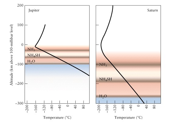 Perfis atmosféricos de Júpiter e Saturno. Júpiter tem uma atmosfera mais compacta, com pouco menos de 100 km, devido à sua maior gravidade. A atmosfera de Saturno é mais distendida, com cerca de 300 km, e culmina numa espessa camada de névoa fotoquímica. É devido a esta névoa que não observamos a atmosfera de Saturno com a mesma clareza com que observamos a de Júpiter. Note-se também a diferente profundidade em que se formam as nuvens de amónia (NH3), hidrosulfeto de amónia (NH4SH) e água (H2O).