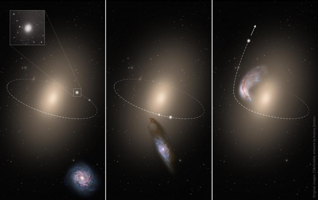 De acordo com os dois investigadores, estes objetos solitários deverão ter residido originalmente no interior de aglomerados. Inicialmente, interações gravitacionais com galáxias massivas vizinhas terão removido as camadas de estrelas mais periféricas, expondo os seus bojos centrais extremamente compactos. A esta provação seguiu-se um encontro próximo com uma terceira galáxia, que terá arremessado estas pequenas galáxias para fora dos respetivos aglomerados, a velocidades superiores a 2.500 km/s!