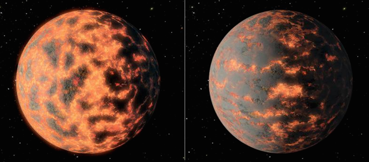 Representação artística do planeta 55 Cancri-e. Num possível cenário, a superfície tem uma actividade geológica frenética e global (esquerda); durante episódios eruptivos muito intensos a atmosfera torna-se mais opaca e impede a saída de radiação infravermelha proveniente do interior (direita). Crédito: NASA/JPL-Caltech/R. Hurt.