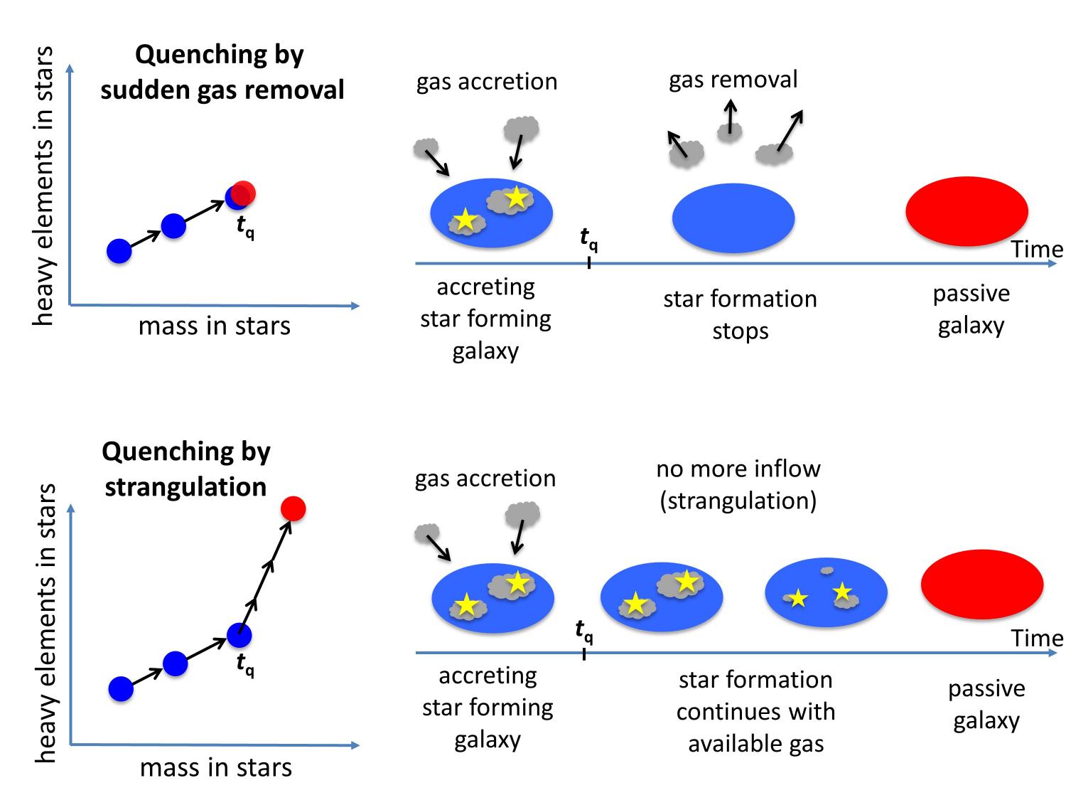 De facto, se a maioria das galáxias deixam de fazer estrelas devido ao mecanismo (1), então o seu conteúdo em metais deve ser semelhante ao que tinham imediatamente antes de ficarem estéreis, pois o gás necessário à formação de estrelas desaparece rapidamente e a galáxia deixa de fazer estrelas abruptamente. Por outro lado, se o mecanismo dominante for o (2), as galáxias continuam a formar estrelas ainda durante milhares de milhões anos, até o reservatório de gás se esgotar, permitindo a síntese de mais metais. Neste caso as galáxias devem ter uma metalicidade mais elevada.