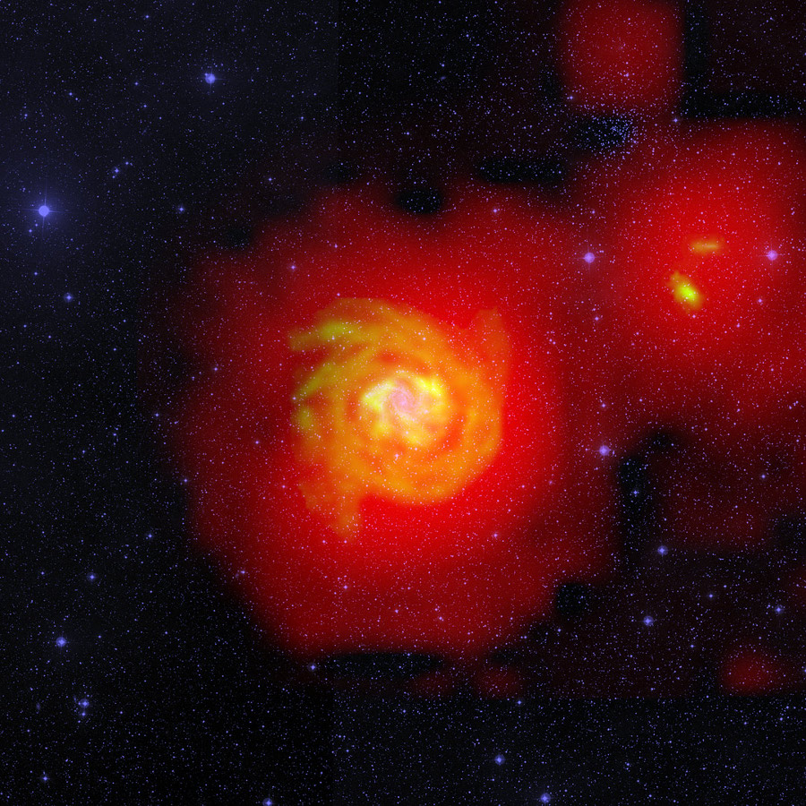 E o segredo da NGC 6946 é este. A galáxia da foto anterior pode ser vista no centro desta imagem (amarelo mais intenso) obtida em ondas de rádio. A enorme mancha vermelha que a rodeia é uma nuvem de hidrogénio no espaço intergaláctico. O gás flui continuamente para a galáxia por acção da gravidade, renovando o seu stock de matéria prima para a formação de estrelas — uma espécie de fonte da juventude. Crédito: D. J. Pisano (WVU), B. Saxton (NRAO/AUI/NSF), Palomar Observatory & Space Telescope Science Institute 2nd Digital Sky Survey (Caltech), Westerbork Synthesis Radio Telescope.