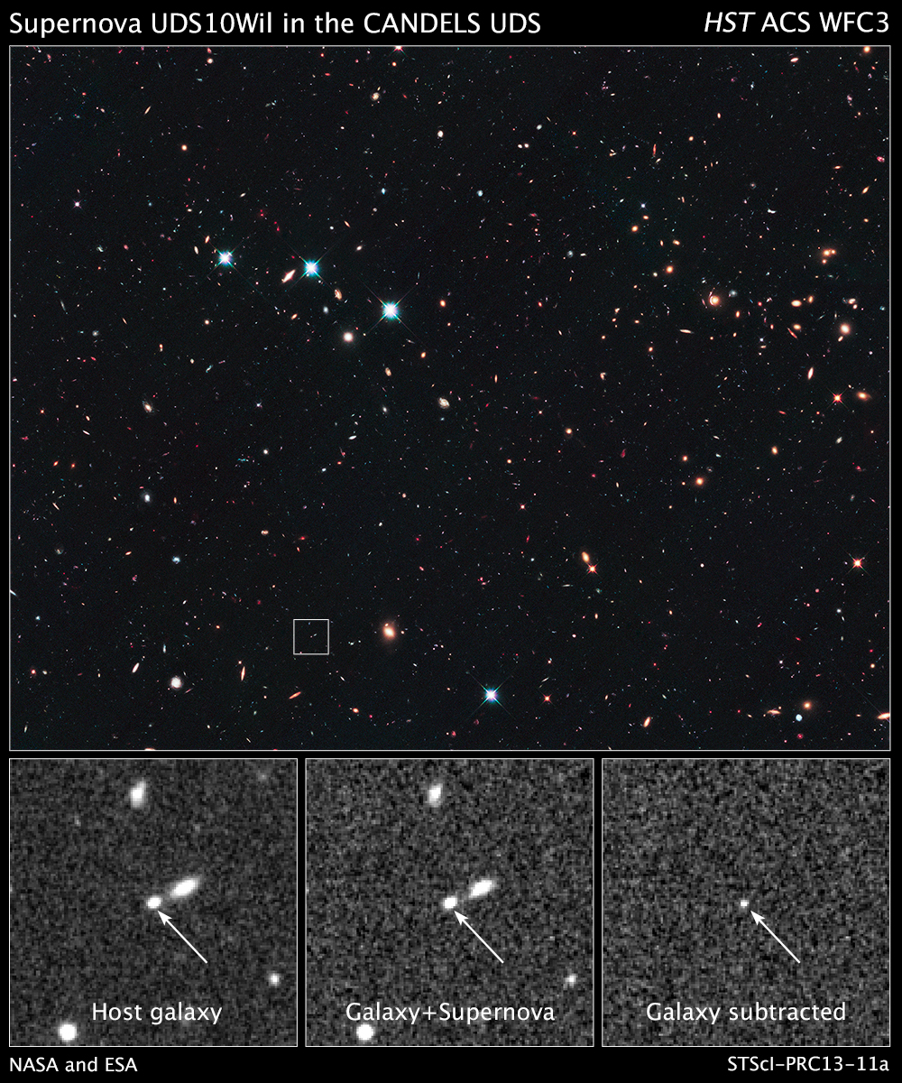 Supernova de tipo Ia numa galáxia a mais de 10 mil milhões de anos-luz, descoberta pelo projecto CANDELS (Cosmic Assembly Near-infrared Deep Extragalactic Legacy Survey). Crédito: NASA.