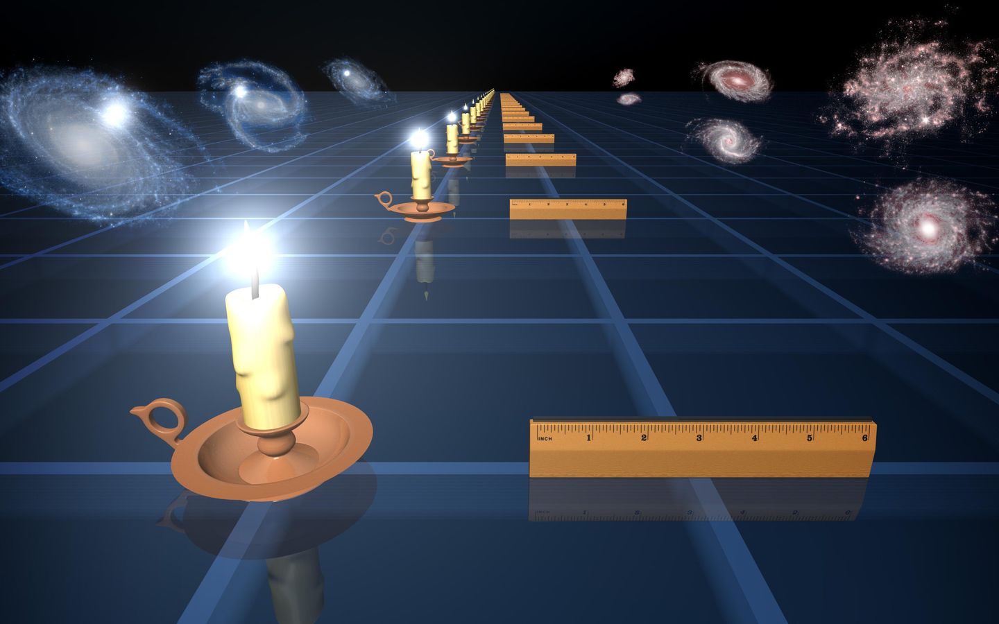A observação de supernovas de tipo Ia, de brilho conhecido, em galáxias distantes permite a determinação precisa das suas distâncias e medir o ritmo de expansão do Universo. Crédito: NASA/JPL-Caltech.