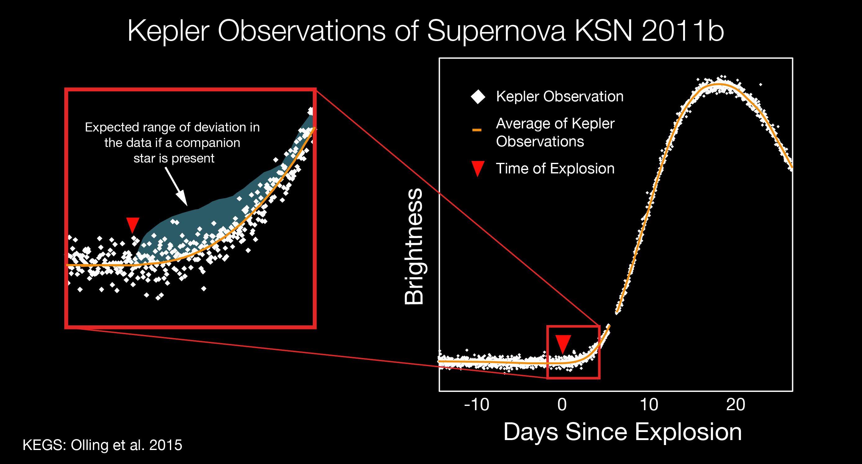 O primeiro artigo utilizou dados recolhidos por um caçador de exoplanetas, o telescópio Kepler, da NASA, que observa uma porção fixa do céu medindo a luminosidade de objectos no campo de visão com grande precisão a cada 30 minutos. Os autores monitorizaram 400 galáxias com o Kepler na esperança de detectar alguma supernova e conseguiram detectar 3 de tipo Ia. Os dados mostram portanto o brilho das supernovas desde os primeiros momentos da explosão. Ora, se as anãs brancas que explodiram nestas 3 supernovas tivessem companheiras normais (cenário SD), nas primeiras horas ou dias deveria ter sido detectado um brilho adicional devido à colisão do material da supernova com a dita estrela. Os astrónomos não detectaram qualquer indício desse incremento no brilho nas 3 supernovas, sugerindo que todas foram geradas pelo mecanismo DD.