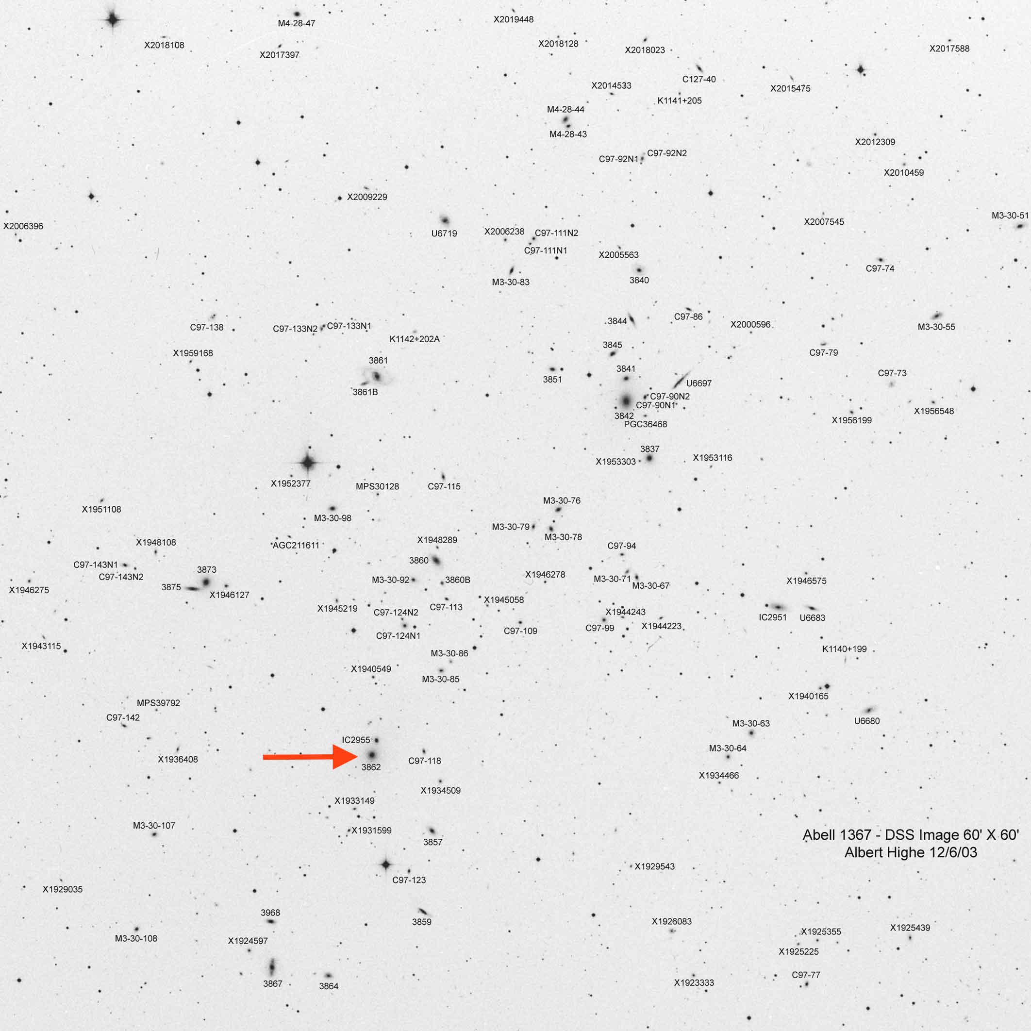 O enxame Abell 1367 e a posição da galáxia activa NGC3862. Crédito: Palomar Sky Survey e Albert Highe. Fonte: http://pw2.netcom.com/~ahighe/A1367_60_60F.jpg