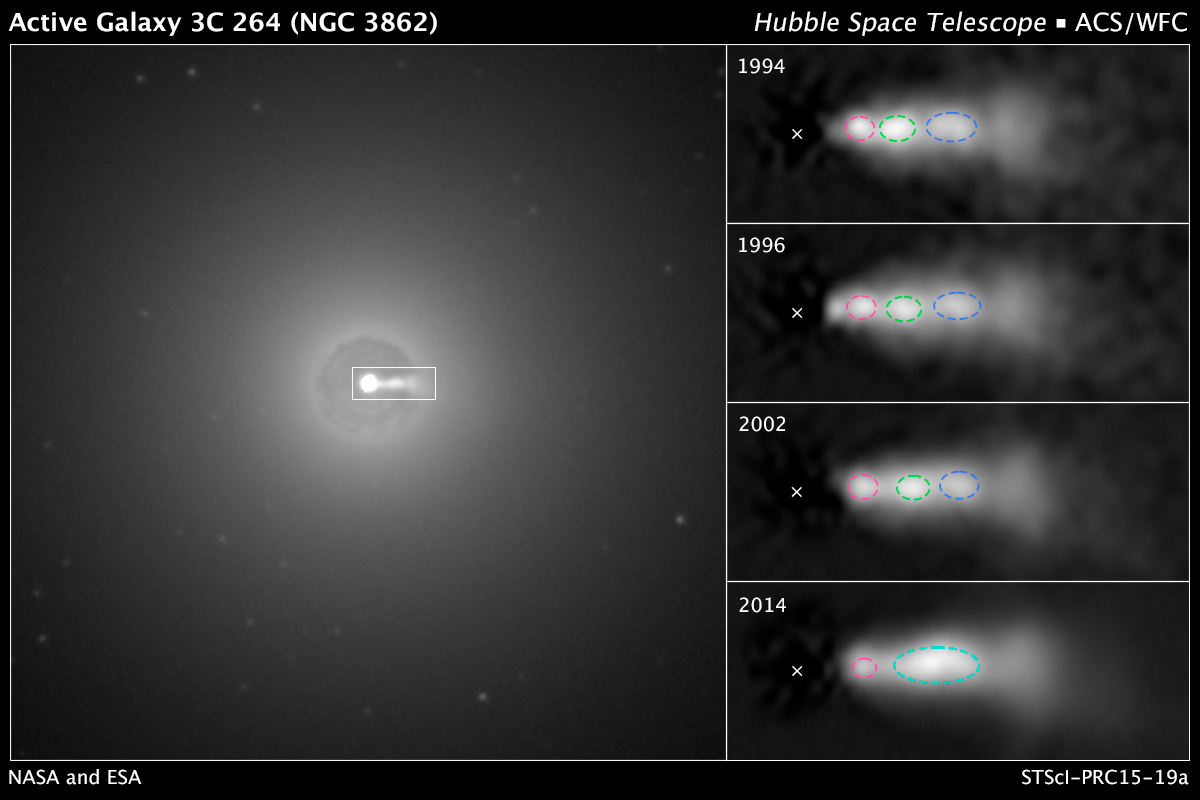 A galáxia elíptica NGC 3862 e o jacto de plasma emitido a partir das imediações do buraco negro super-maciço no seu centro. As imagens à direita mostram a evolução temporal do jacto mostrando bolhas individuais de material (as regiões mais brilhantes assinaladas a tracejado). Nas últimas duas imagens, de 2002 e 2014, é evidente a colisão das bolhas “verde” e “azul”, e o consequente aumento de luminosidade dessa região do jacto. O “X” marca a posição do buraco negro. Crédito: NASA, ESA e E. Meyer (STScI).