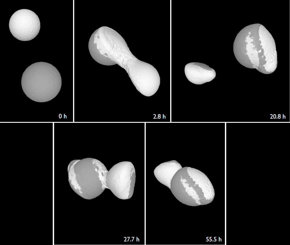 Recorrendo a simulações computorizadas tridimensionais, Martin Jutzi da Universidade de Berna, na Suíça, e Erik Asphaug da Universidade do Estado do Arizona, nos Estados Unidos, demonstraram como estas morfologias poderão ter sido criadas por colisões a baixas velocidades entre objetos de tamanhos ligeiramente diferentes. Este trabalho foi divulgado na semana passada num artigo publicado na revista Science Express.
