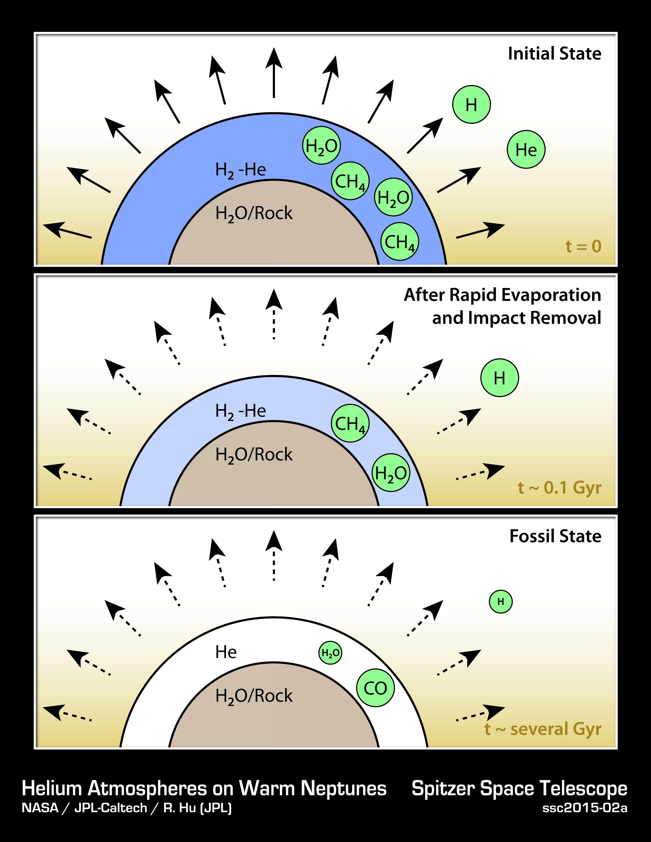 Foi precisamente para tentar explicar esta discrepância entre os modelos teóricos de interiores planetários e as observações que uma equipa de cientistas liderada por Renyu Hu, um NASA Hubble Fellow no Jet Propulsion Laboratory, propôs um novo cenário. Os cientistas observaram que estes planetas estão sujeitos a temperaturas muito elevadas que facilitam a perda de gás das atmosferas para o espaço — as moléculas do gás a elevadas temperaturas têm uma energia cinética capaz de escapar à gravidade do planeta. Mais ainda, dos dois gases dominantes, o hidrogénio e o hélio, o primeiro é mais susceptível de ser eliminado pois é 4 vezes mais leve.