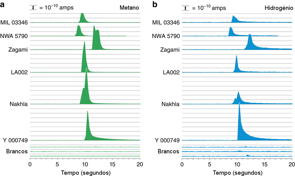 Deteção de metano e hidrogénio em amostras de 6 meteoritos marcianos.