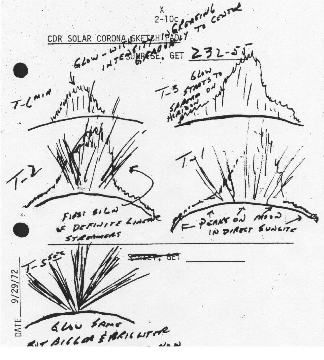 desenho_brilho_horizonte_Lua_Cernan_Apollo17_290972Esboço do nascer do Sol visto pelo astronauta Eugene Cernan da missão Apollo 17 a partir da órbita lunar. Os desenhos mostram o fulgor da luz zodiacal e dos raios crepusculares acompanhado por um estranho arco de luz brilhante sobre o horizonte da Lua.